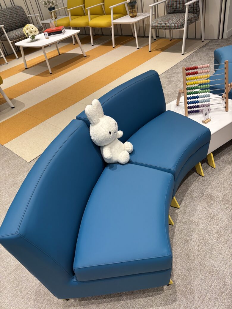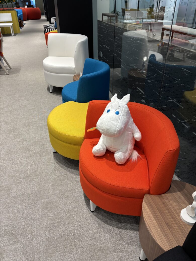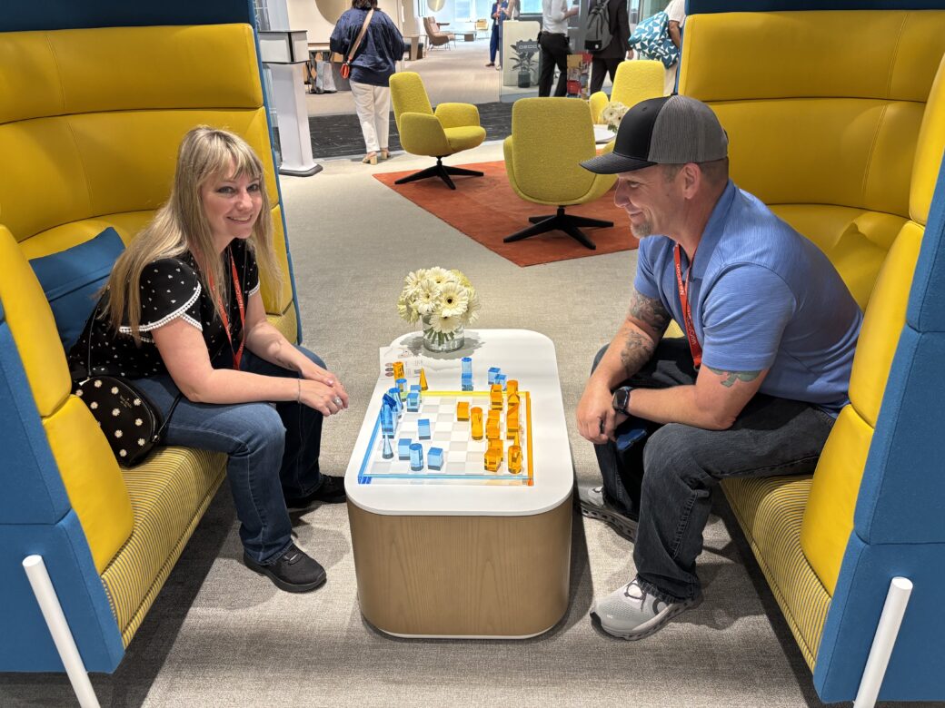 Here Deb and Jean are seated in Arcadia‘s new Achellita! The collection includes lounge chairs and connecting tables that are modular in form to create functional and playful configurations. Other new products include Flipside Kids, Ravelle, Reymi Guest and Lounge, and TOOthePoint!
